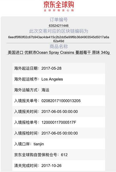 美國優(yōu)鮮沛蔓越莓干利用京東區(qū)塊鏈防偽追溯平臺進行溯源