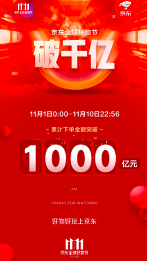 11月10日22點(diǎn)56分,京東11.11全球好物節(jié)累計(jì)下單金額突破1000億元。在9大主題日和7大專場(chǎng)活動(dòng)的串聯(lián)下,京東聯(lián)動(dòng)站內(nèi)站外、線上線下打造的11.11購(gòu)物季高潮迭起。11月1日,超級(jí)秒殺日開門紅,下單金額超過(guò)258億元,超過(guò)1億件商品迅速飛到消費(fèi)者手中。11月3日,超級(jí)神券日,“滿199減100”成為最受消費(fèi)者歡迎的“神券”。