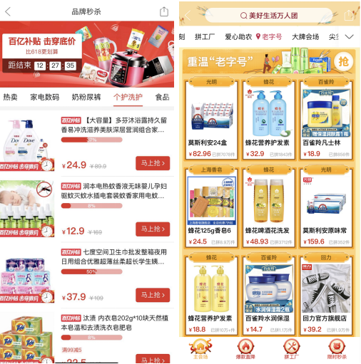 活動(dòng)數(shù)據(jù)顯示,家電數(shù)碼、日化、母嬰類產(chǎn)品擁有最高的達(dá)成率:190元的美的電壓力鍋、89元的蘇泊爾煎餅機(jī)、54.9元的九陽(yáng)榨汁機(jī)、259.9元的格蘭仕微波爐等家電系列標(biāo)品,成為截至目前的明星產(chǎn)品。汰漬、多芬、七度空間等個(gè)護(hù)洗護(hù)類高頻消費(fèi)品,在平均成團(tuán)時(shí)長(zhǎng)上占據(jù)明顯優(yōu)勢(shì);“上海老字號(hào)品牌特惠專場(chǎng)“則在整體成交轉(zhuǎn)化率上維持領(lǐng)先。