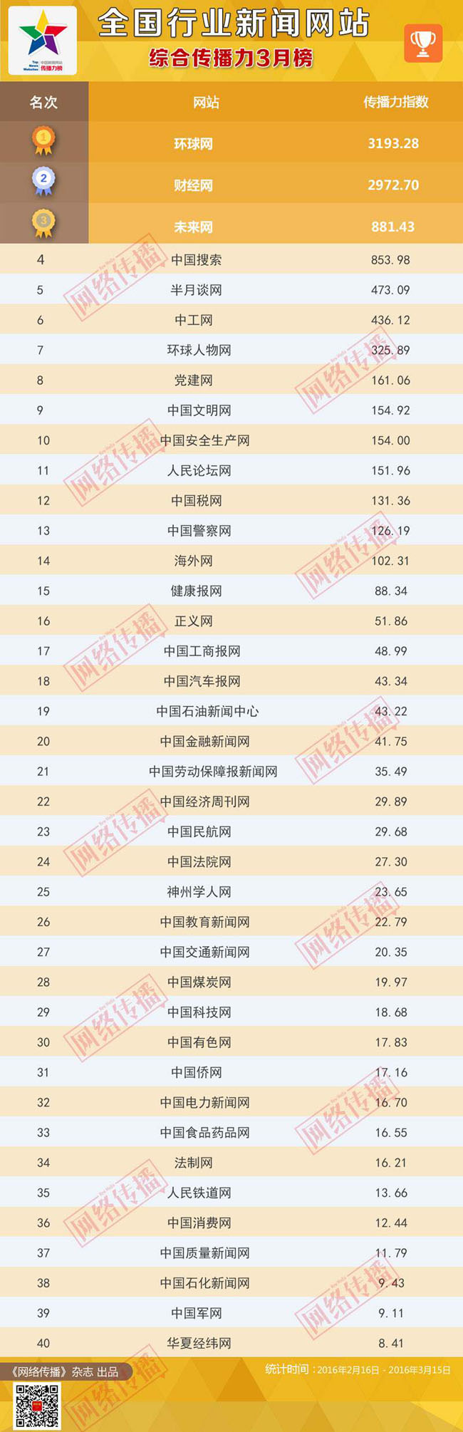 中央網(wǎng)信辦《網(wǎng)絡傳播》雜志傾力打造的“全國行業(yè)新聞網(wǎng)站傳播力2016年3月榜”今日正式發(fā)布。