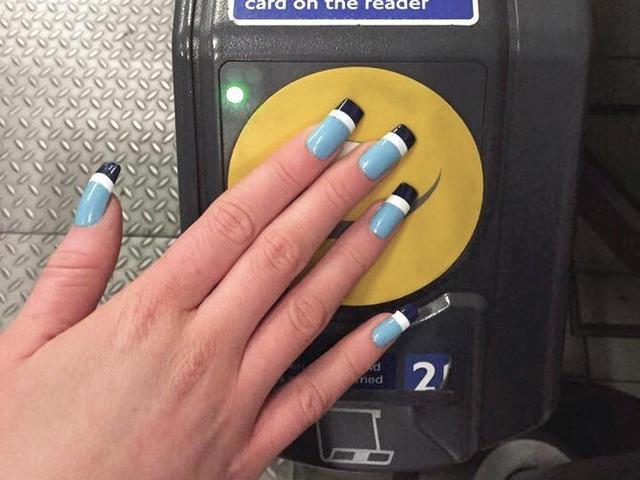 Davis把Oyster卡(公交預(yù)付卡)中的RFID芯片放進(jìn)了丙烯酸材質(zhì)的人工指甲當(dāng)中,佩戴者只要把手指靠近讀卡器就能快速刷卡上車。這樣一來,你就再也不必?fù)?dān)心公交卡忘帶或是弄丟了。