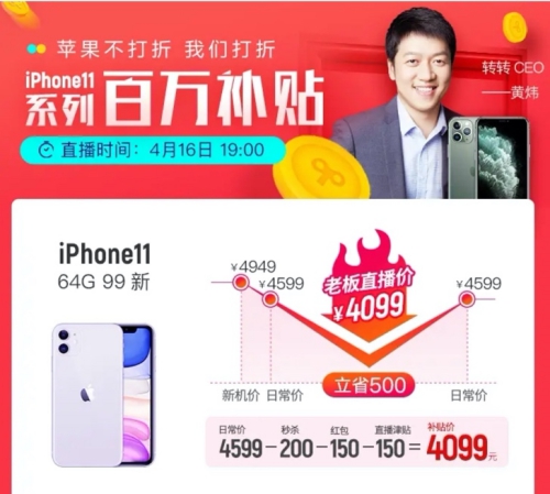 4月16日晚7時,轉(zhuǎn)轉(zhuǎn)CEO黃煒也在自家平臺上首次直播帶貨,售賣平臺自營的以iPhone 11系列為主的蘋果手機。