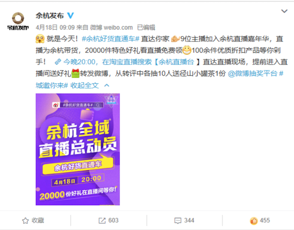 4月18日, @余杭發(fā)布 正式發(fā)布預(yù)告,表示將于18日晚20:00,在淘寶直播為余杭帶貨。