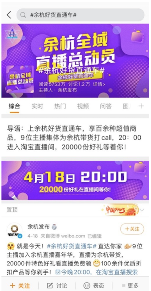 本次#余杭好貨直通車#的宣推充分認(rèn)識(shí)到了流量的重要作用。在直播前,@余杭發(fā)布 充分利用微博的巨大聲量進(jìn)行傳播推廣,再導(dǎo)流到淘寶進(jìn)行進(jìn)一步的經(jīng)濟(jì)轉(zhuǎn)化。作為一個(gè)綜合平臺(tái),微博在這個(gè)過程中能夠?yàn)槠放铺峁┲辈デ、直播中、直播后期的全流程話題營銷。在微博進(jìn)行前期宣推,到淘寶進(jìn)行直播售賣,最后再回到微博進(jìn)行效果傳播、品牌印象加固,形成了一次直播帶貨活動(dòng)的完美閉環(huán)。