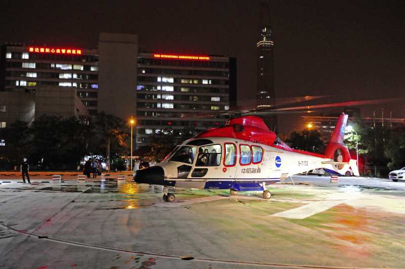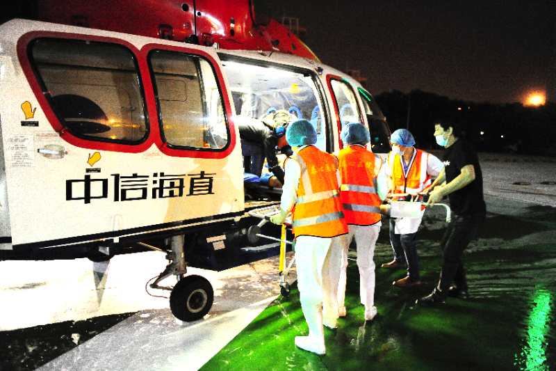 北大醫(yī)療海洋石油醫(yī)院立即啟動(dòng)應(yīng)急預(yù)案,將患者心電圖、搶救用藥信息通過(guò)泰心互聯(lián)網(wǎng)醫(yī)院系統(tǒng)傳到泰心醫(yī)院胸痛中心,并決定啟動(dòng)直升機(jī)救援,由海上平臺(tái)醫(yī)生護(hù)送患者前往泰心醫(yī)院胸痛中心。中信海洋直升機(jī)股份有限公司相關(guān)部門迅速進(jìn)行準(zhǔn)備,申請(qǐng)空域、準(zhǔn)備飛機(jī)、研究航線及天氣。同時(shí),泰心醫(yī)院迅速啟動(dòng)綠色通道,后勤人員迅速準(zhǔn)備停機(jī)坪,急診醫(yī)護(hù)隨時(shí)準(zhǔn)備接診,心內(nèi)科、超聲科、介入中心工作人員也嚴(yán)陣以待;飛機(jī)于23點(diǎn)21分升空,前往平臺(tái)救援!9日00點(diǎn)13分抵達(dá)海上平臺(tái)。00點(diǎn)20分飛機(jī)在平臺(tái)起飛,載著患者飛越112海里(200多公里),于1點(diǎn)10分抵達(dá)泰心醫(yī)院停機(jī)坪。
