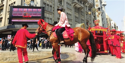 昨天,在天津市金街上演了一場別開生面的民俗快閃表演,現(xiàn)場騎著高頭大馬迎娶新娘的“新郎倌”和喜慶的花轎,吸引了眾多游客駐足觀看。