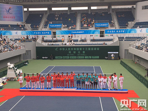 6月18日,第十三屆全運會網(wǎng)球團體賽決賽在天津網(wǎng)球中心舉行。江蘇隊奪得男子組冠軍,天津隊奪得女子組冠軍。男子組最后決勝隊伍江蘇隊與浙江隊實力相近,最后以江蘇隊雙打配合優(yōu)勢險勝浙江隊。而女子組團體賽天津隊以兩名實力戰(zhàn)將張帥、彭帥,兩場單打以明顯優(yōu)勢奪得冠軍。