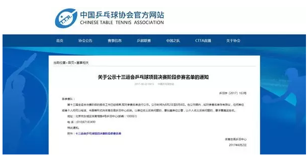 8月2日,國家體育總局乒羽中心在中國乒乓球協(xié)會網(wǎng)站上公示了8月將在天津舉行的第十三屆全運會乒乓球項目參賽名單。