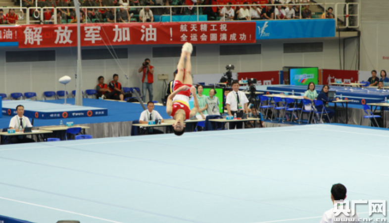 體操單項(xiàng)決賽沒(méi)有設(shè)置選手賽前熱身時(shí)間,各位選手在集體亮相后快速進(jìn)入了比賽狀態(tài)。天津隊(duì)穆濟(jì)勒排在第二位出場(chǎng),他選擇以向前1260度空翻接540度空翻的高難度動(dòng)作開(kāi)場(chǎng),接著前手翻前屈兩周,540度接720度空翻都干凈利落的完成。結(jié)束動(dòng)作穆濟(jì)勒選擇了直體后空翻轉(zhuǎn)體1080度,并完美落地。雖然穆濟(jì)勒出場(chǎng)順序較為靠前,但是裁判員并沒(méi)有吝惜分?jǐn)?shù),難度分6.1,完成分8.967,總分15.067分。