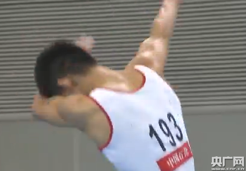 國(guó)家隊(duì)名將、來(lái)自福建的林超攀排在第五位出場(chǎng),剛剛獲得體操男子全能金牌的他以預(yù)賽第一的成績(jī)進(jìn)入決賽。他以一個(gè)前屈兩周180度空翻開(kāi)場(chǎng),順利完成;蛟S是因?yàn)榍髣傩那校谥蟮?/span>540度接720度落地時(shí)稍有下蹲動(dòng)作,完成度稍差。隨后的兩串后團(tuán)兩周720度空翻、前360接前900度空翻再無(wú)瑕疵,最后的直體后空翻轉(zhuǎn)體1080度也穩(wěn)穩(wěn)落地。難度分6.2,完成分8.667,總分14.867分。