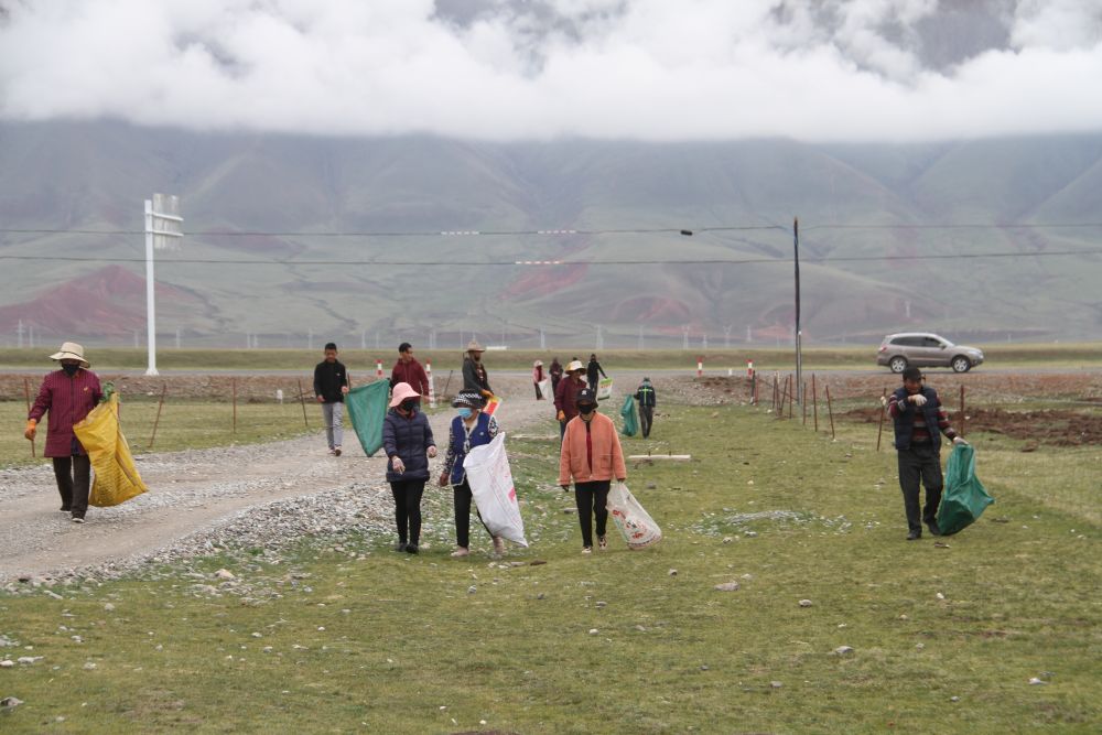 三江源國家公園治多生態(tài)環(huán)保協(xié)會(huì)的志愿者在撿拾垃圾(6月15日攝)。