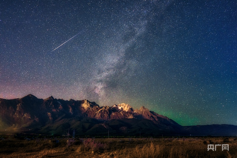 壯麗的銀河拱橋橫跨玉龍十三峰,流星適時闖入鏡頭,記錄下大自然的鬼斧神工(央廣網(wǎng)發(fā) 李思翰 攝)