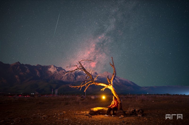 攝影師用燈光點亮枯木,一顆明亮的流星恰好劃過,仿佛連接了大地與蒼穹(央廣網(wǎng)發(fā) 楚明陽 攝)