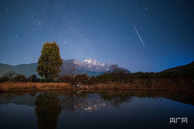 在玉龍雪山甘海子,流星劃過天際,倒映在平靜的水面,構(gòu)成一幅對稱的靜謐畫卷(央廣網(wǎng)發(fā) 戴建峰 攝)
