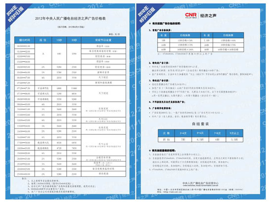 中央人民廣播電臺(tái)中國(guó)之聲、經(jīng)濟(jì)之聲廣告價(jià)格將于2012年8月21日起調(diào)整,調(diào)整后價(jià)格表已于日前正式發(fā)布。全權(quán)負(fù)責(zé)中國(guó)之聲、經(jīng)濟(jì)之聲廣告業(yè)務(wù)經(jīng)營(yíng)的央廣廣告公司授權(quán)本網(wǎng)站獨(dú)家刊載,未經(jīng)授權(quán)請(qǐng)勿擅自刊登或轉(zhuǎn)載,否則將追究相關(guān)法律責(zé)任。