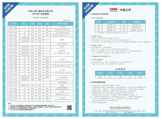 中央人民廣播電臺(tái)中國之聲、經(jīng)濟(jì)之聲廣告價(jià)格將于2013年6月8日起調(diào)整,調(diào)整后價(jià)格表已于日前正式發(fā)布。全權(quán)負(fù)責(zé)中國之聲、經(jīng)濟(jì)之聲廣告業(yè)務(wù)經(jīng)營的央廣廣告公司授權(quán)本網(wǎng)站獨(dú)家刊載,未經(jīng)授權(quán)請勿擅自刊登或轉(zhuǎn)載,否則將追究相關(guān)法律責(zé)任。