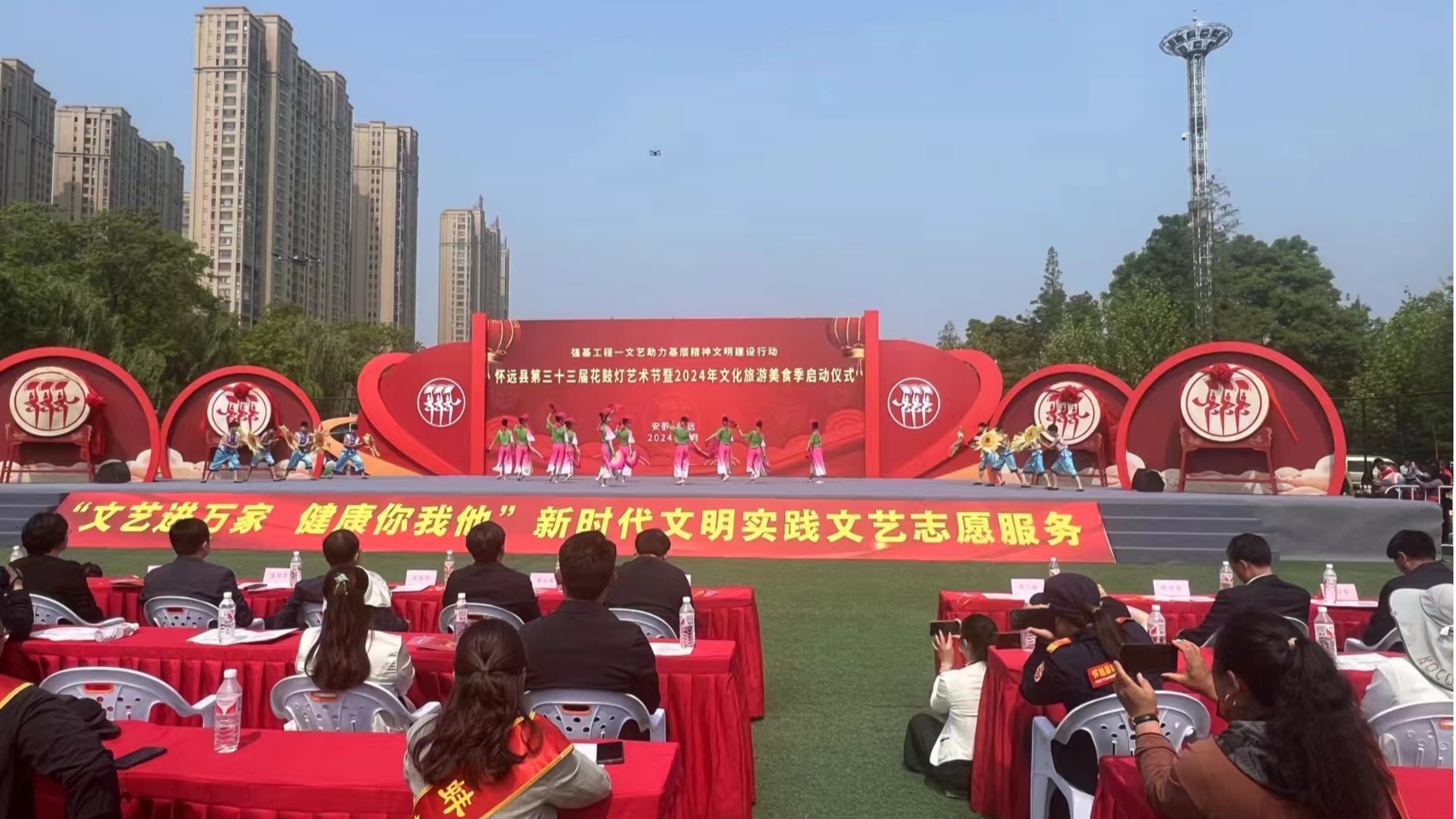 5月6日,在濱淮濕地公園東廣場,懷遠縣第三十三屆花鼓燈藝術(shù)節(jié)暨2024年文化旅游美食季舉行了盛大的啟動儀式。