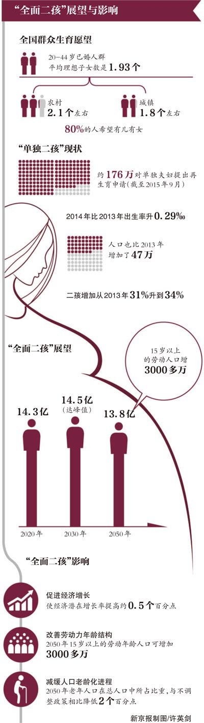 國家衛(wèi)計委:新增可生二孩的人里40到49歲占一半,國家衛(wèi)生計生委副主任王培安表示,據(jù)預測,實施全面二孩政策,到2050年可增加3000多萬勞動力,勞動力年齡結構有所改善;到2050年老年人口在總人口中所占比重,與不調(diào)整政策相比降低2個百分點,將在一定程度上減緩人口老齡化進程 優(yōu)勢。