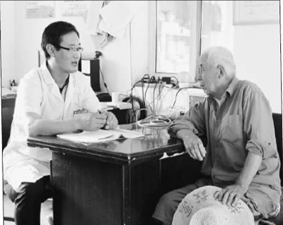 11點,上午的病人終于看完。施震林伸伸腰,趴在桌子上休息5分鐘后,又拿起了血壓監(jiān)測儀,準(zhǔn)備動身!鞍从媱,今天要去上莊村!笔┱鹆终f,“最近天氣太熱,村里有幾位老人身體不好,我過去看一下!