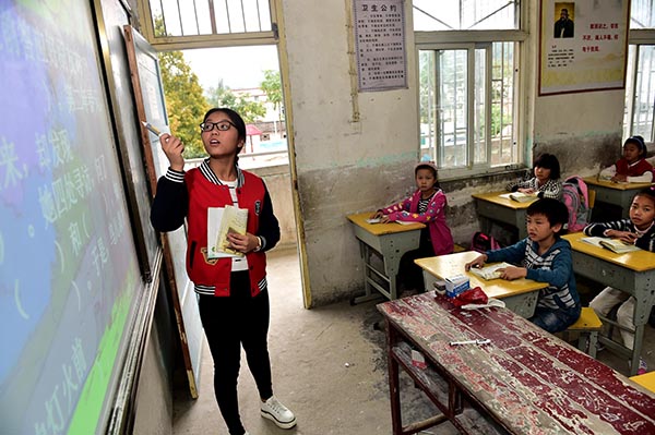 10月12日,“90后”特崗教師熊丹在給孩子們上語(yǔ)文課。