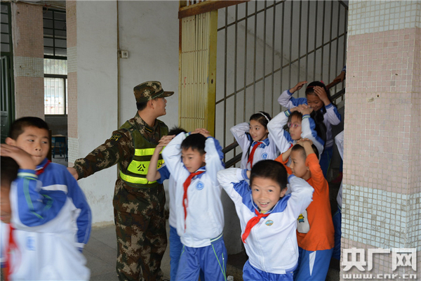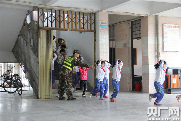 廣東汕頭云澳邊防派出所官兵在組織云澳中心小學的學生進行緊急疏散演練。劉建高 攝