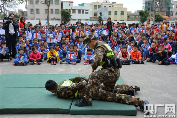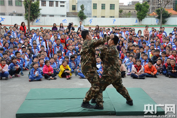 汕頭市云澳中心小學的學生們目不轉睛地看著汕頭邊防的武警學員演練抓捕術。辛雄發(fā) 攝