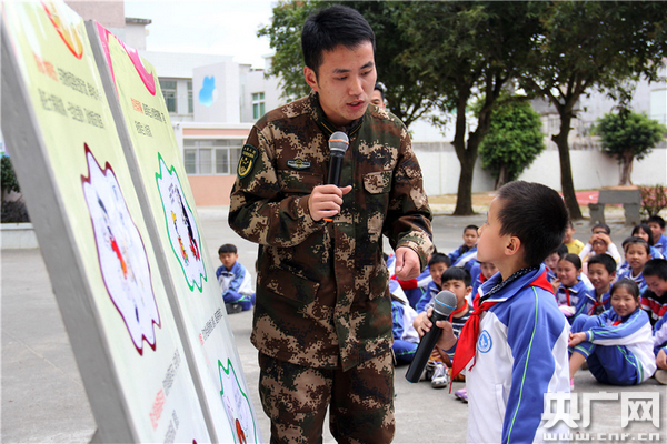 云澳邊防派出所學員林澤鵬在與向云澳中心小學學生講解安全知識。劉建高 攝