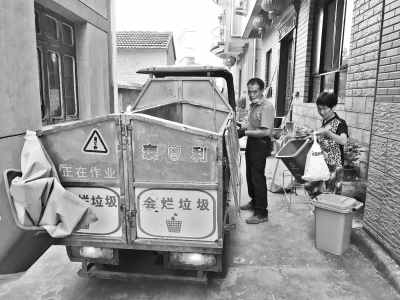 ▲圖為六角塘村垃圾收集員嚴(yán)志進(左)每天清晨收集各家各戶的分類垃圾。