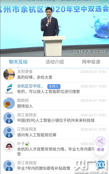 “在這萬物生長、欣欣向榮的季節(jié)里,疫情無法阻擋春天的腳步,也無法阻擋我們求賢若渴的決心。在這里,我向大家發(fā)出最誠摯的邀請:這個(gè)春天,讓我們一起相約在余杭!”直播中,區(qū)委組織部(人才辦)相關(guān)負(fù)責(zé)人向人才們伸出“橄欖枝”。來自阿里巴巴、之江實(shí)驗(yàn)室、貝達(dá)藥業(yè)、西奧電梯、諾爾康等企業(yè)人才代表為余杭“代言”推介。