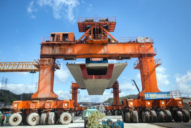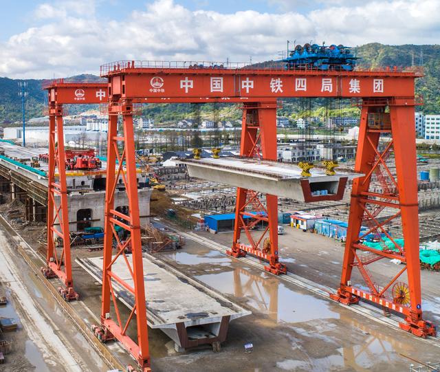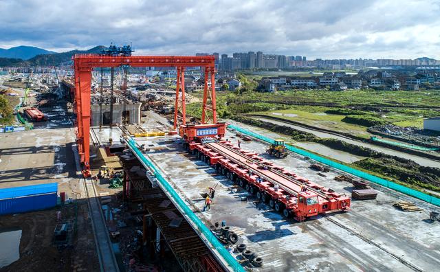 杭紹臺(tái)鐵路施工現(xiàn)場(chǎng),900噸運(yùn)梁機(jī)正在運(yùn)送箱梁 郎成濤 攝