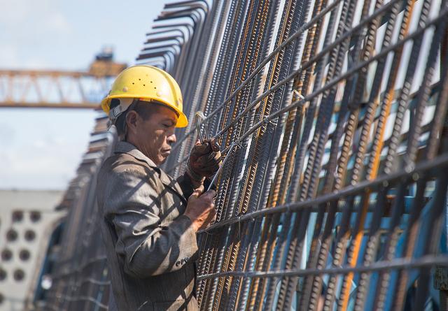 杭紹臺(tái)鐵路臺(tái)州制梁場(chǎng)施工現(xiàn)場(chǎng),工人正在綁扎鋼筋 郎成濤 攝