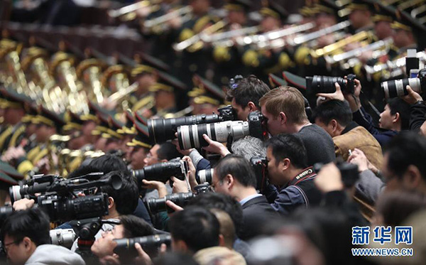 3月15日,全國政協(xié)十三屆一次會議在北京人民大會堂舉行閉幕會。這是記者在會場采訪。 新華社記者 邢廣利 攝