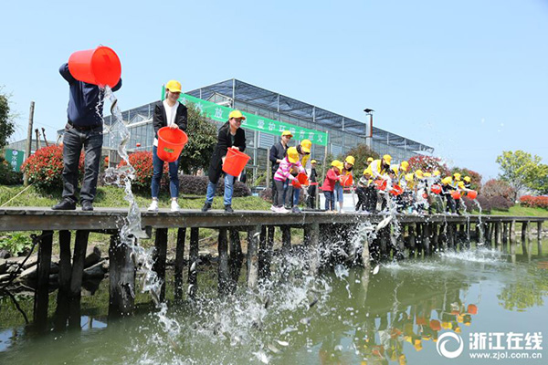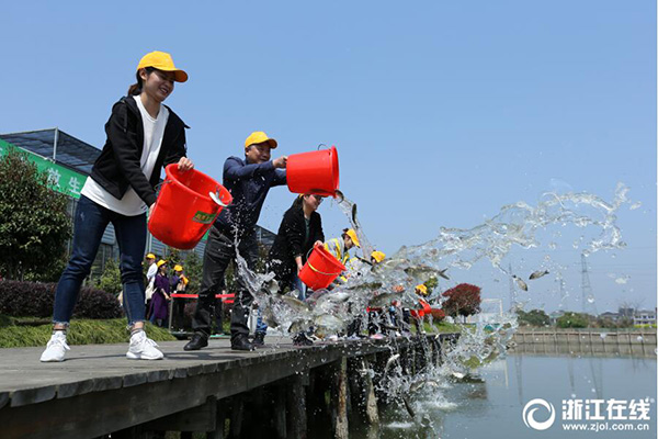3月27日,德清縣乾元鎮(zhèn)各級人大代表、新居民以及當(dāng)?shù)赜變簣@小朋友等50多人,在該鎮(zhèn)聯(lián)合村、恒星村等地,把花鰱、草魚以及花骨魚等2萬余尾魚苗放歸清澈的河水中,以進(jìn)一步改善水質(zhì),確!拔逅仓巍背晒。(沈興華 倪立芳 攝)